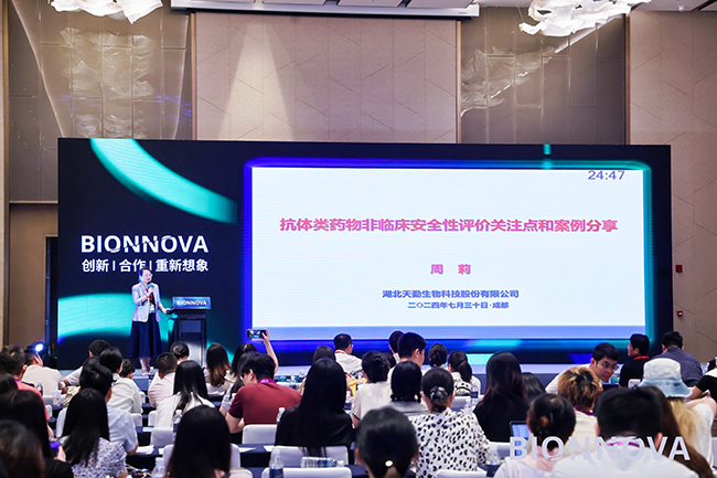 天勤生物執行副總裁周莉博士在【抗體藥物開發前沿】分論壇上也帶來了主題為“抗體藥物非臨床安全性評價關注點和案例分享”的精彩演講。周莉博士著重介紹了抗體藥物非臨床安全性評價的關注點,從種屬選擇、組織交叉反應、免疫原性、免疫毒性、生殖毒性、PK/PD六個方面進行了解讀,并通過實際案例展示了天勤生物在抗體藥物非臨床安全研究中的經驗。周莉博士的報告內容翔實、分析透徹,彰顯了天勤生物在非臨床安全研究領域的深厚底蘊與創新能力。